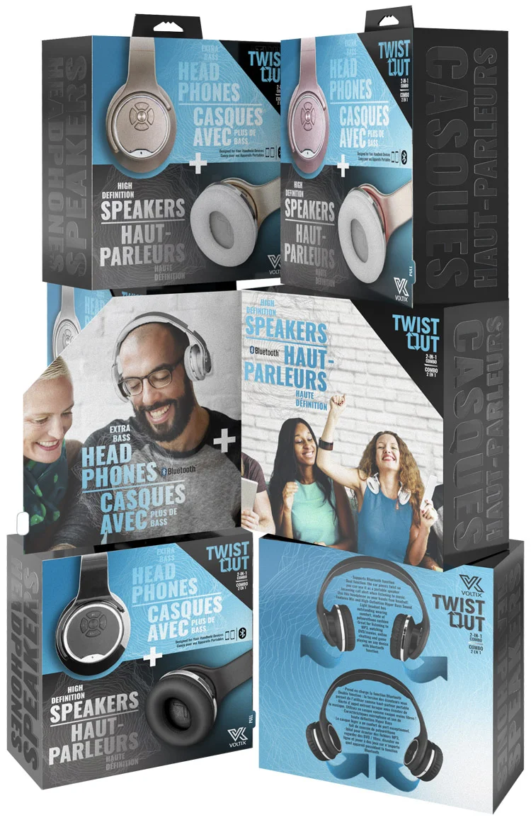 VOLTIX Twist Out is a set of headphones that turn into speakers by flipping the ear muffs. This solution features a door flap that when open reveals lifestyle images showing both functions. The Twist Out was sold in Canada so the verbiage had to be presented in English and French